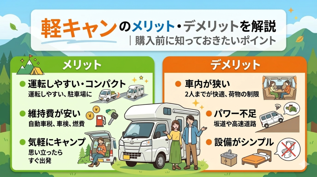 軽キャンピングカーのメリット・デメリットを解説。価格、維持費、車内スペース、車中泊の快適性など購入前に知っておきたいポイントを初心者向けに紹介します。