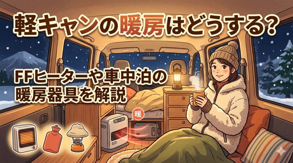 軽キャンピングカーの暖房はどうする?FFヒーター・電気毛布・セラミックヒーターなど、冬の車中泊で使える暖房器具と電気の使い方を初心者向けに解説します。