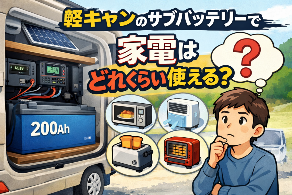 軽キャンやキャンピングカーのサブバッテリーで家電はどれぐらい使えるのかを,。200Ahリチウムバッテリーを例に、電子レンジ・クーラー・トースター・セラミックヒーターなどの使用時間や走行充電、ソーラー充電の実際も紹介します。